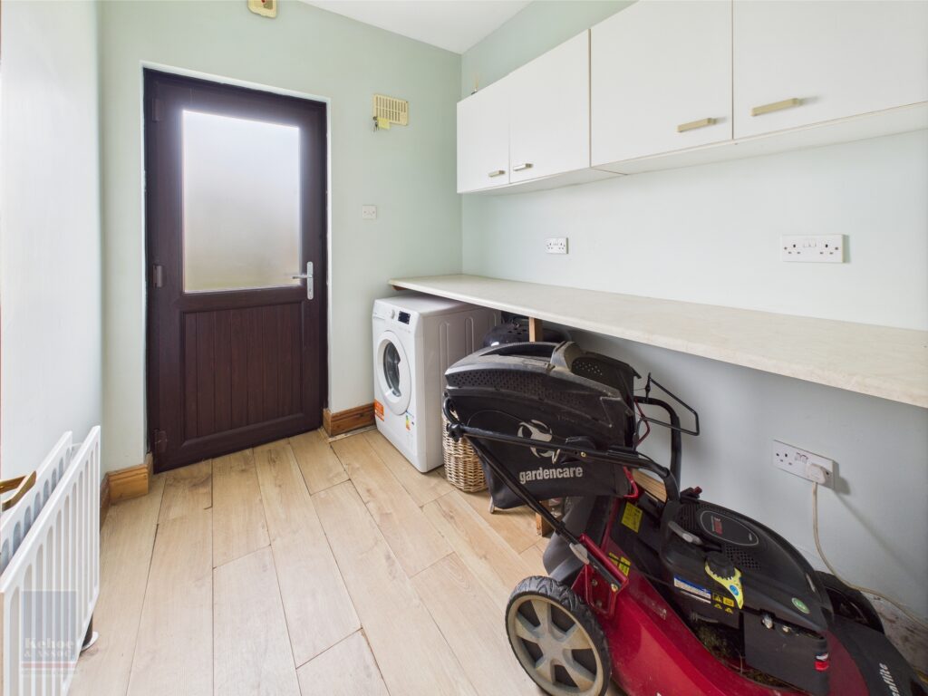 Utility Room 2.38m x 2.00m With built-in storage presses, worktop, washing machine, laminate floor and door to outside.