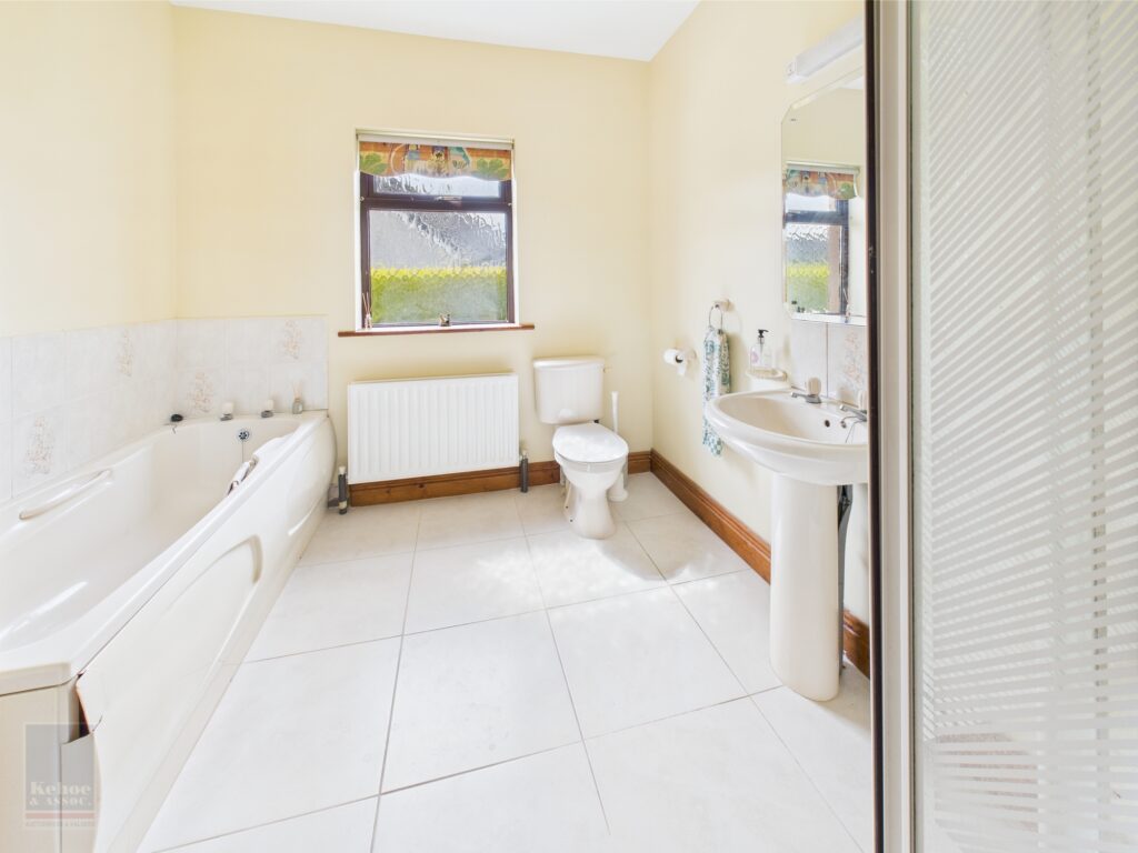 Bathroom 2.97m x 2.58m Tiled shower stall with electric shower, bath, w.c., w.h.b., part tiled walls and tiled floor.