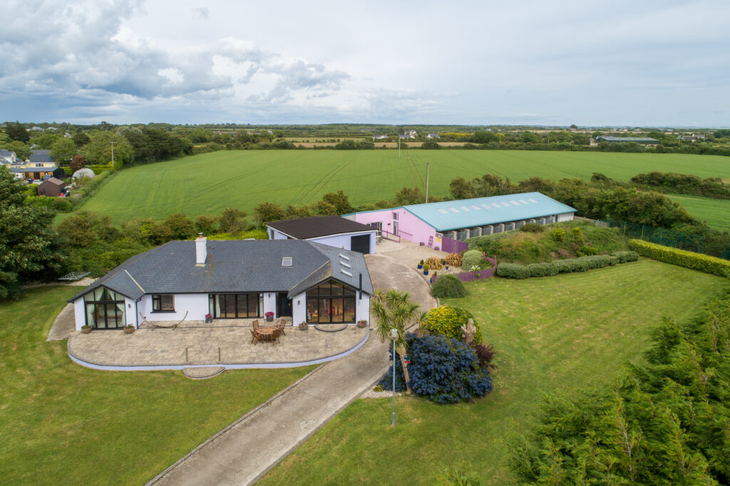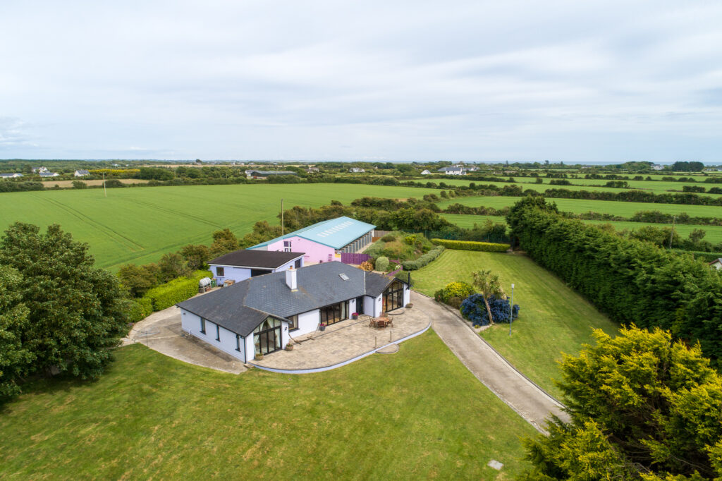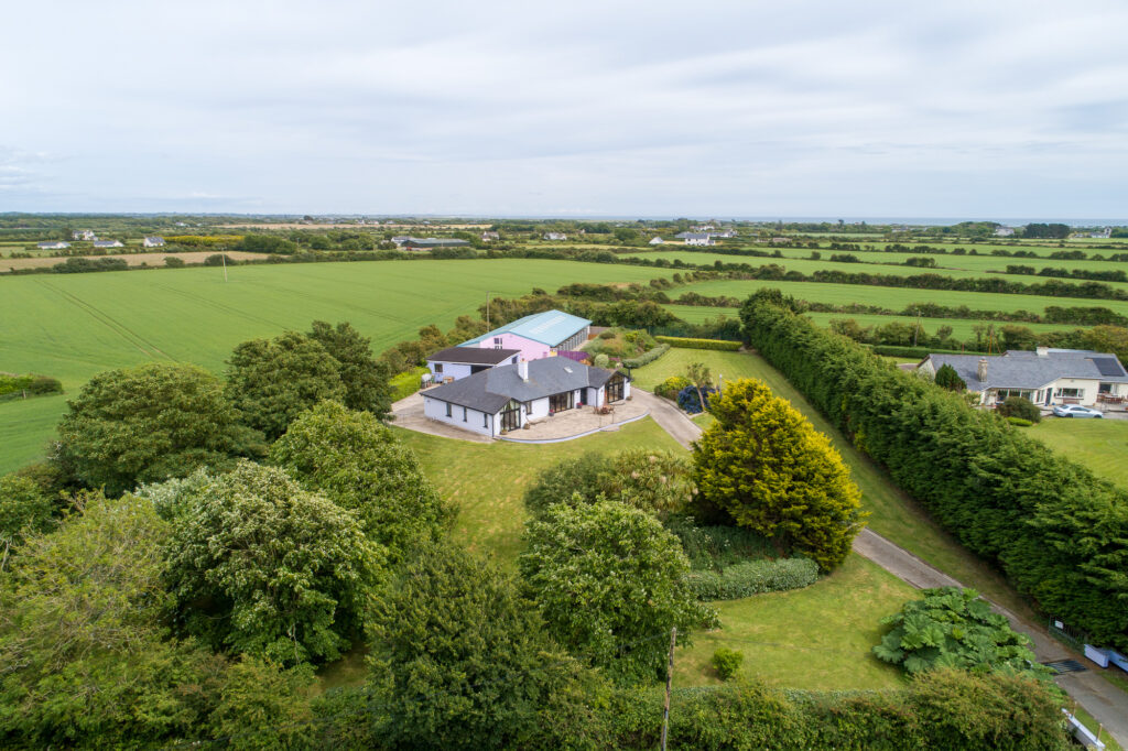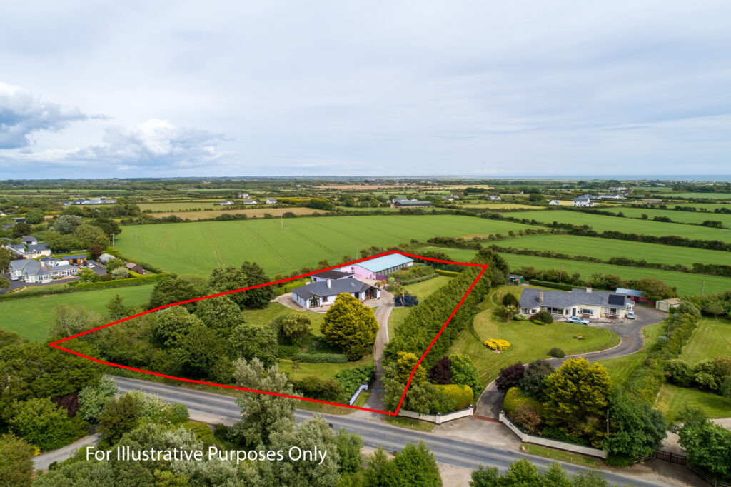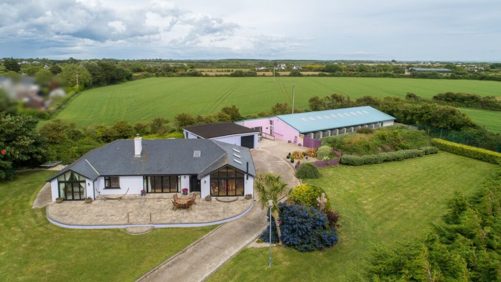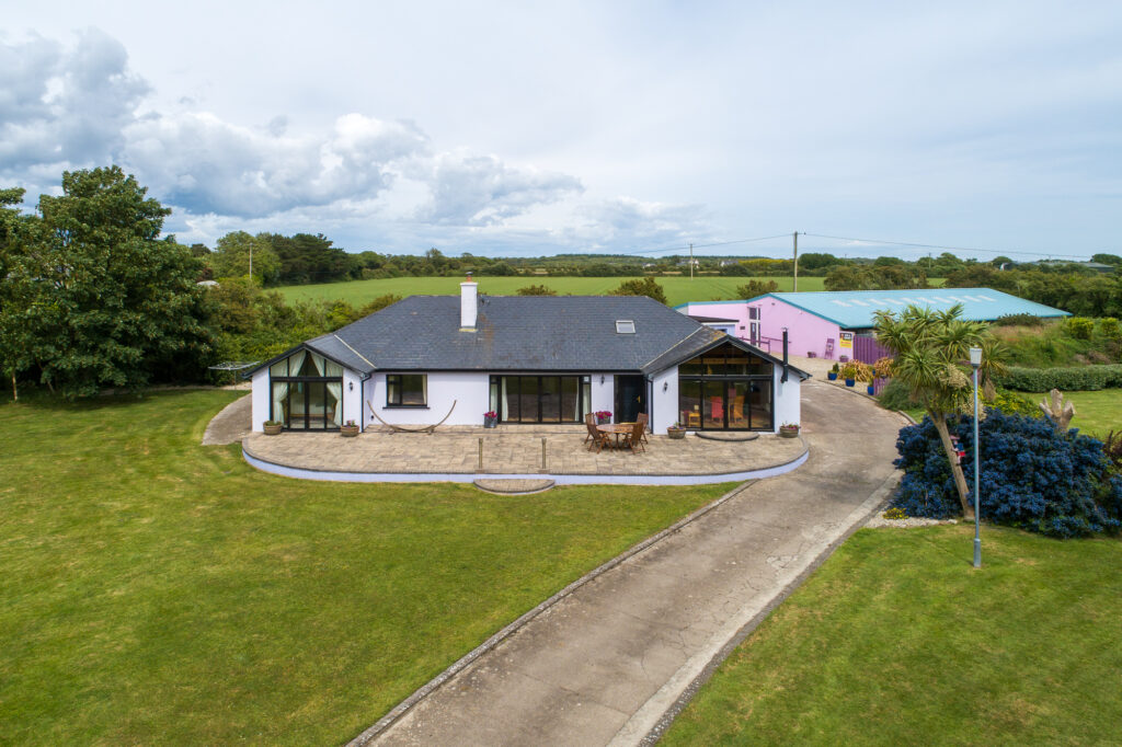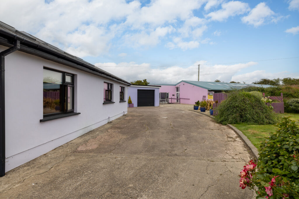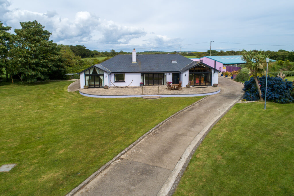 This exceptional opportunity offers the rare chance to acquire both a beautifully appointed 4-bedroom family home and a separate high-spec commercial premises. Positioned side by side, this configuration offers excellent lifestyle flexibility and strong business potential in a peaceful coastal setting. Set well back from the road and entirely hidden from view behind mature boundaries, this superb 4-bedroom bungalow offers peaceful seclusion on a beautifully landscaped site extending to c. 0.70 hectares / 1.73 acres. A sweeping driveway meanders through expansive lawns and leads to a generous south-westerly patio terrace that spans the full width of the residence. From this slightly elevated position, the house enjoys a tranquil garden outlook with rolling green space, manicured planting, and complete privacy.