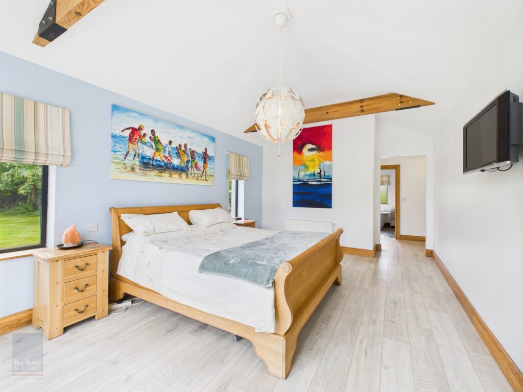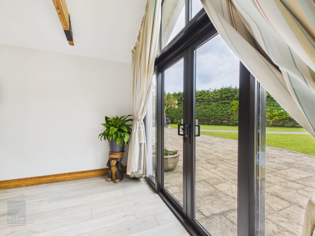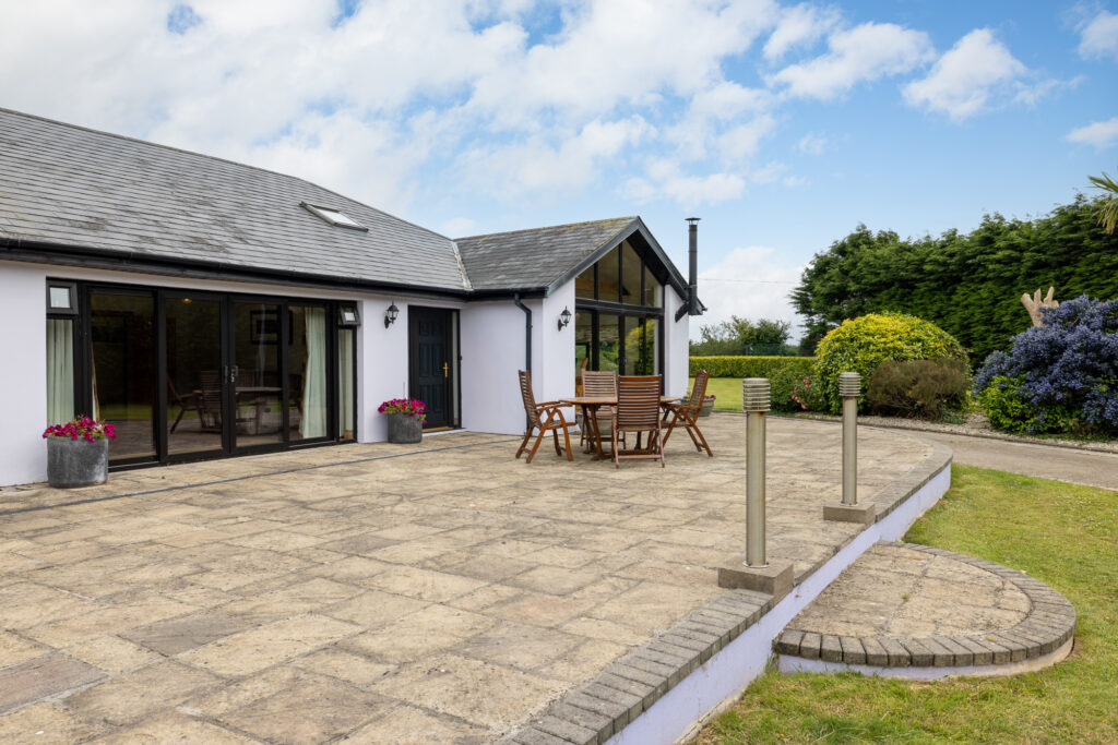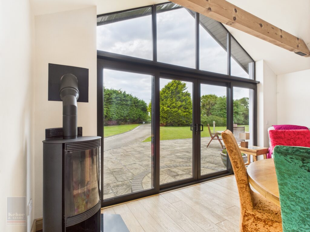 The residence itself extends to c. 214 sq.m. / 2,303 sq.ft. and is designed with a strong emphasis on light, flow, and flexibility. Internally, vaulted ceilings in the dining room and master bedroom add volume and elegance, while floor-to-ceiling glazing and three sets of sliding doors ensure a strong connection between indoor living and the surrounding landscape. The exposed ceiling beams in the main living areas are a standout feature, reclaimed from a 200-year-old mill, adding a sense of heritage and authenticity to the home’s character. All floors, doors, and architraves are solid oak, contributing to the home’s warm, tactile finish and enduring quality. The south-westerly orientation bathes the home in light throughout the day and invites easy al fresco living in warmer months.