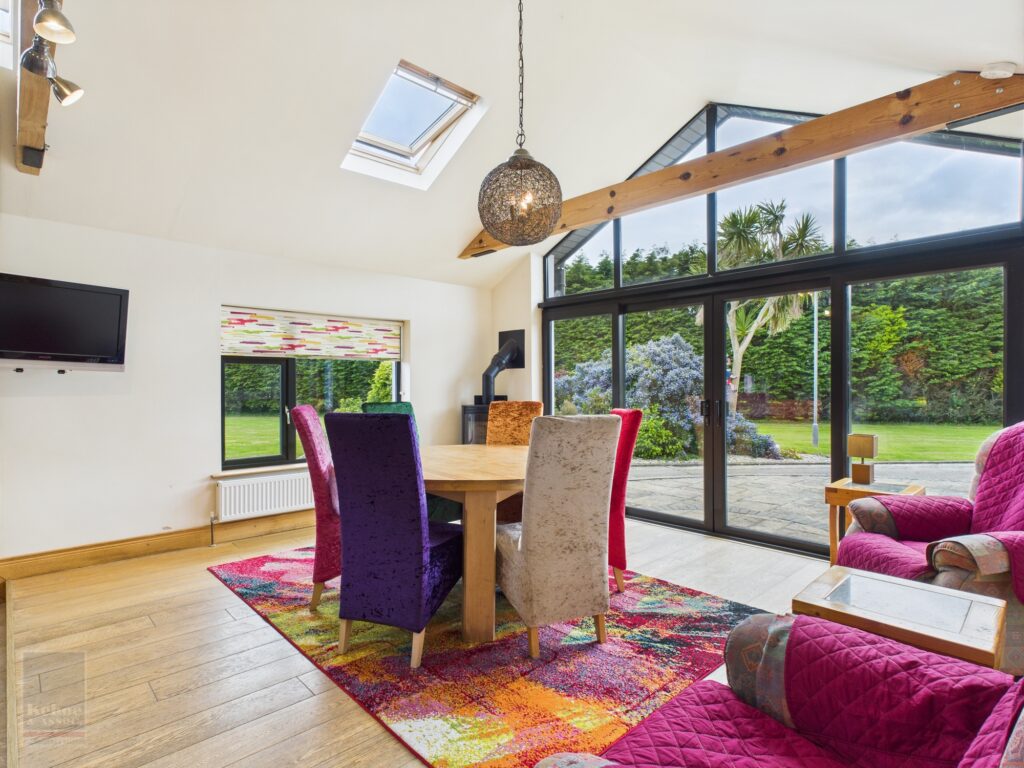 | Dining Room | 5.04m x 4.09m | Solid oak floor, vaulted ceiling with exposed timber beams, feature solid fuel stove with granite hearth, floor to ceiling windows with south westerly aspect and sliding doors to external patio area. |