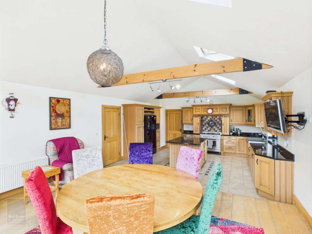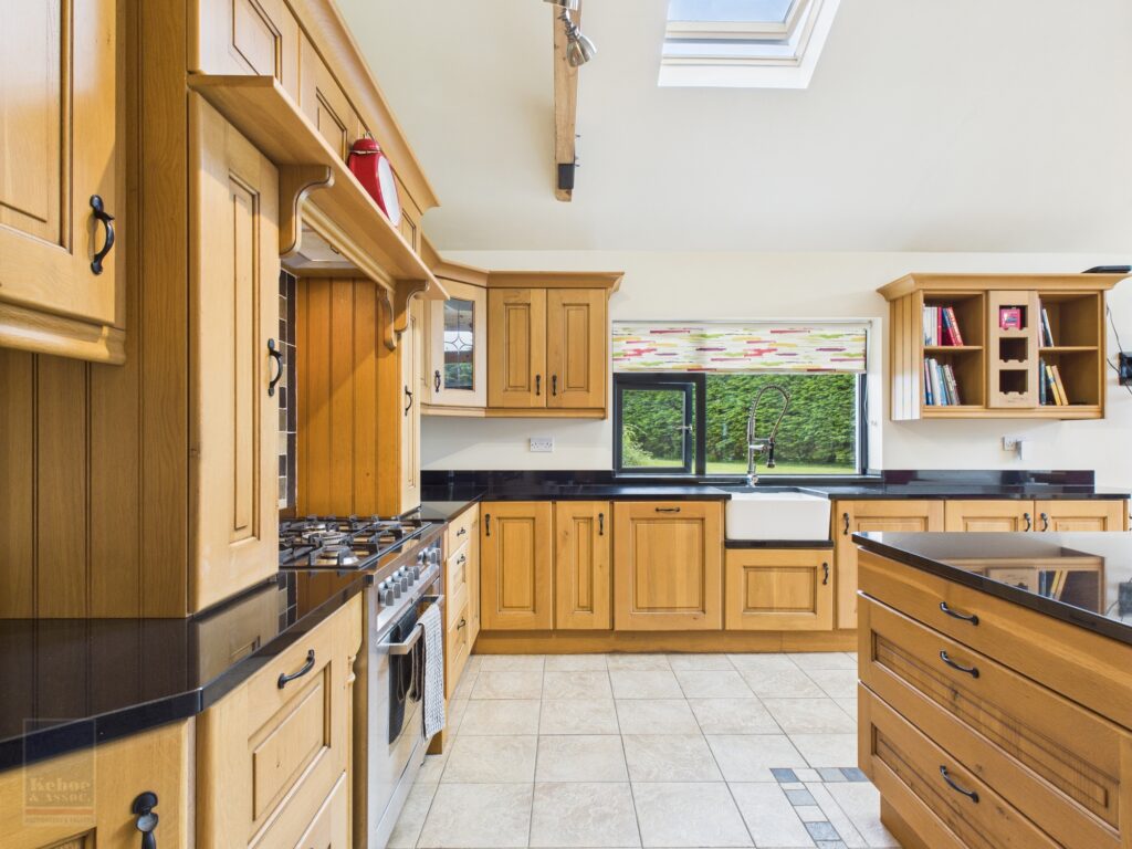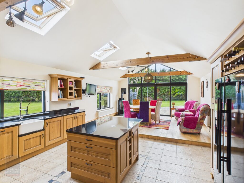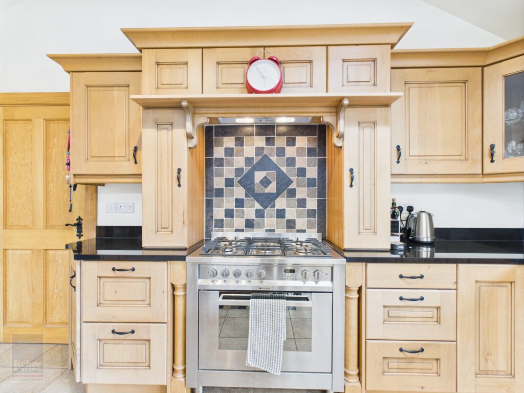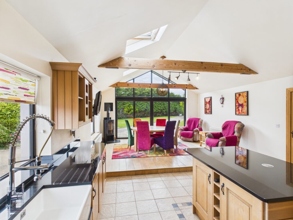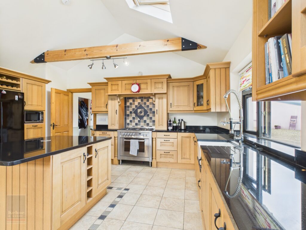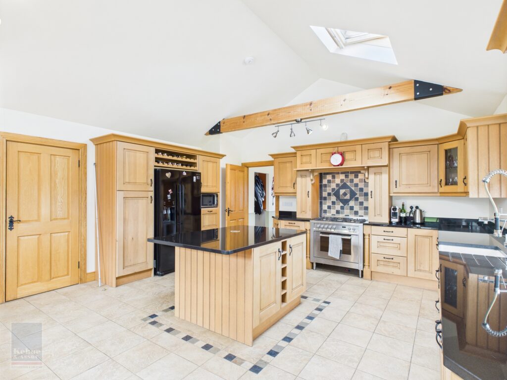 | Kitchen | 5.04m x 4.68m | Tiled floor, custom built oak kitchen with island unit and granite worktops, integrated Samsung fridge freezer, integrated microwave, Hotpoint range oven with 5-ring gas hob, overhead extractor, Belfast sink, vaulted ceiling with exposed timber beams. |