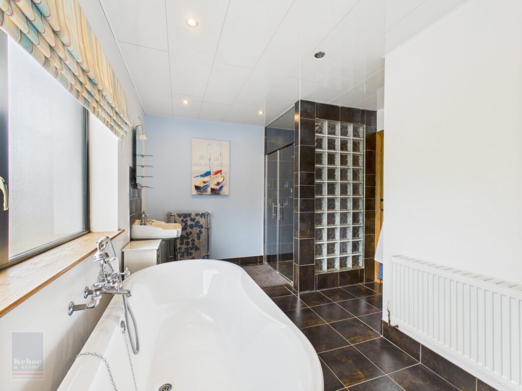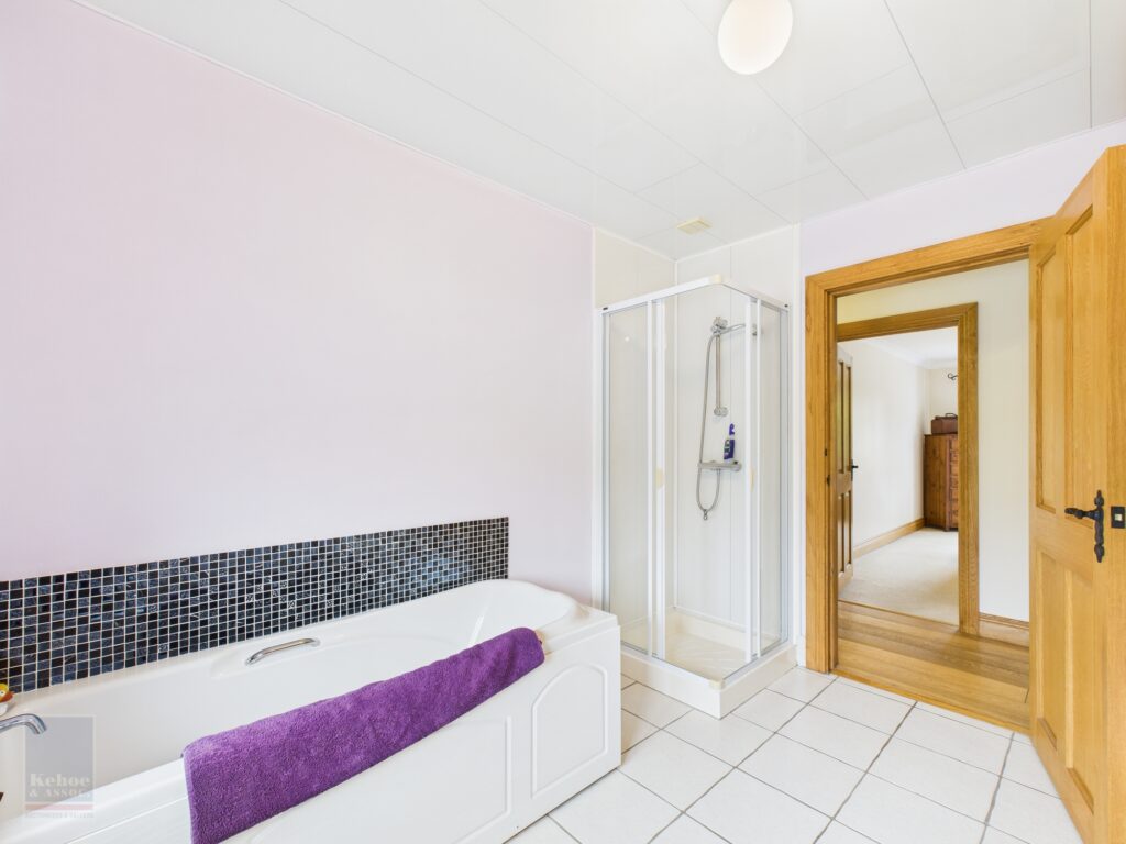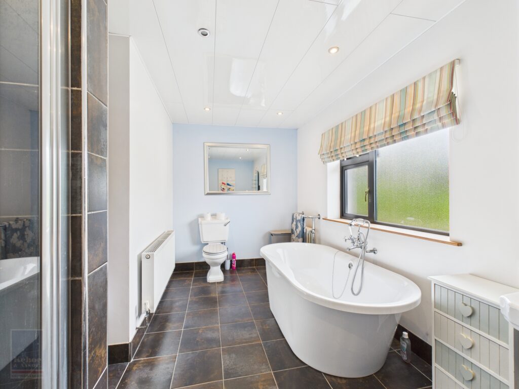 | Ensuite | 4.36m x 2.13m | Tiled floor, w.c., w.h.b., with tiled surround, free-standing luxury bath, extensive walk-in pump shower with tiled and stained glass surround. |