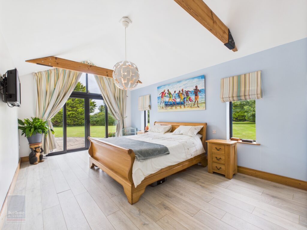 | Bedroom | 5.43m x 3.59m | Laminate floor, vaulted ceiling with exposed timber beams, floor to ceiling windows and sliding doors to south westerly facing patio area. |