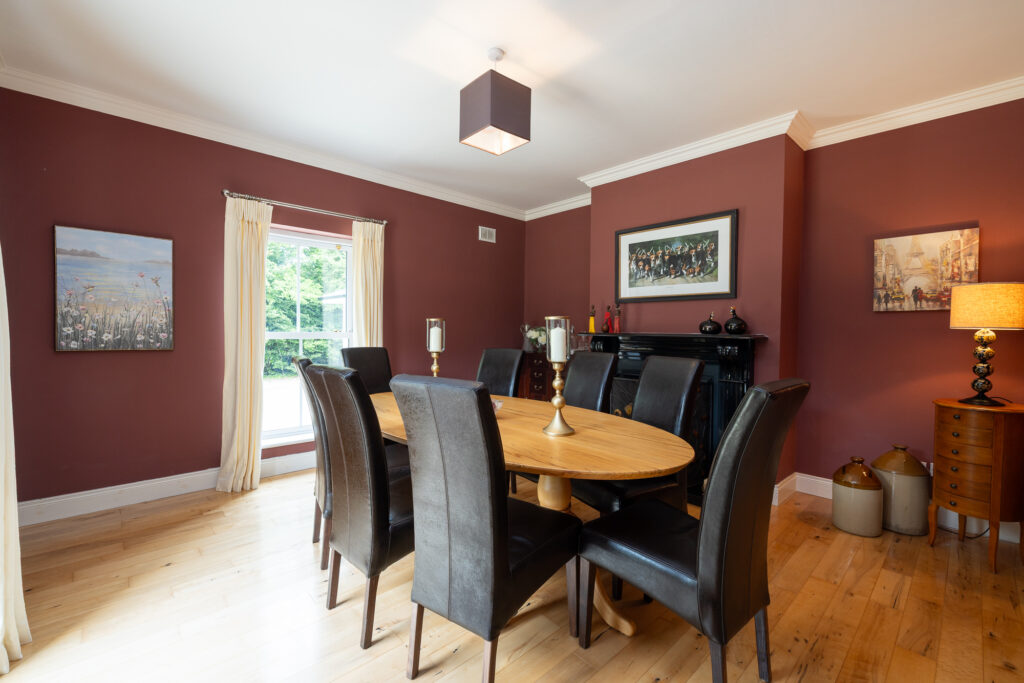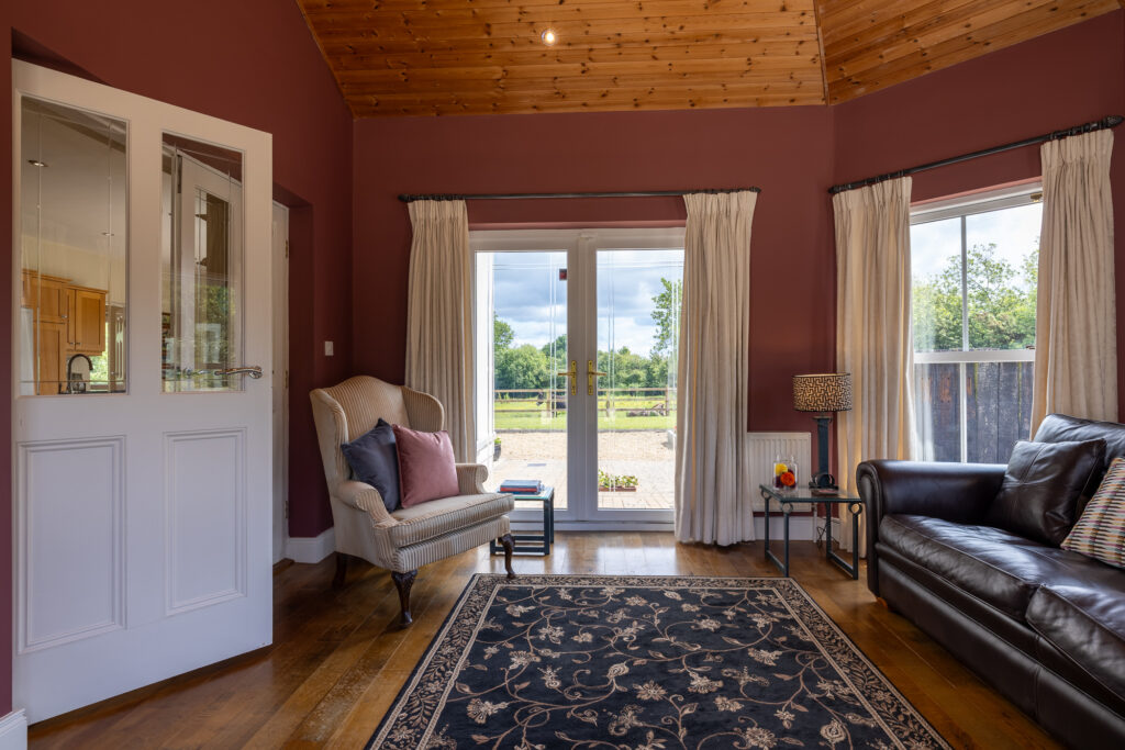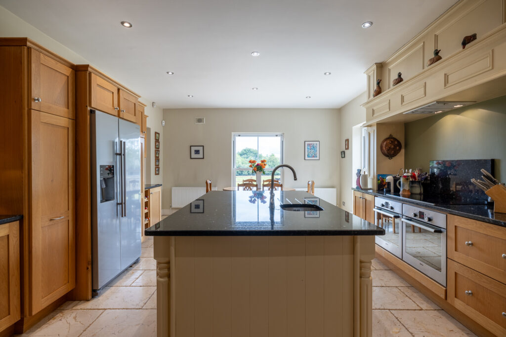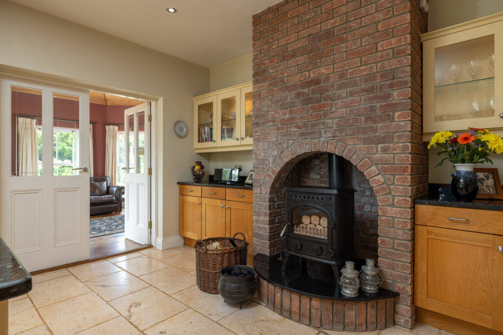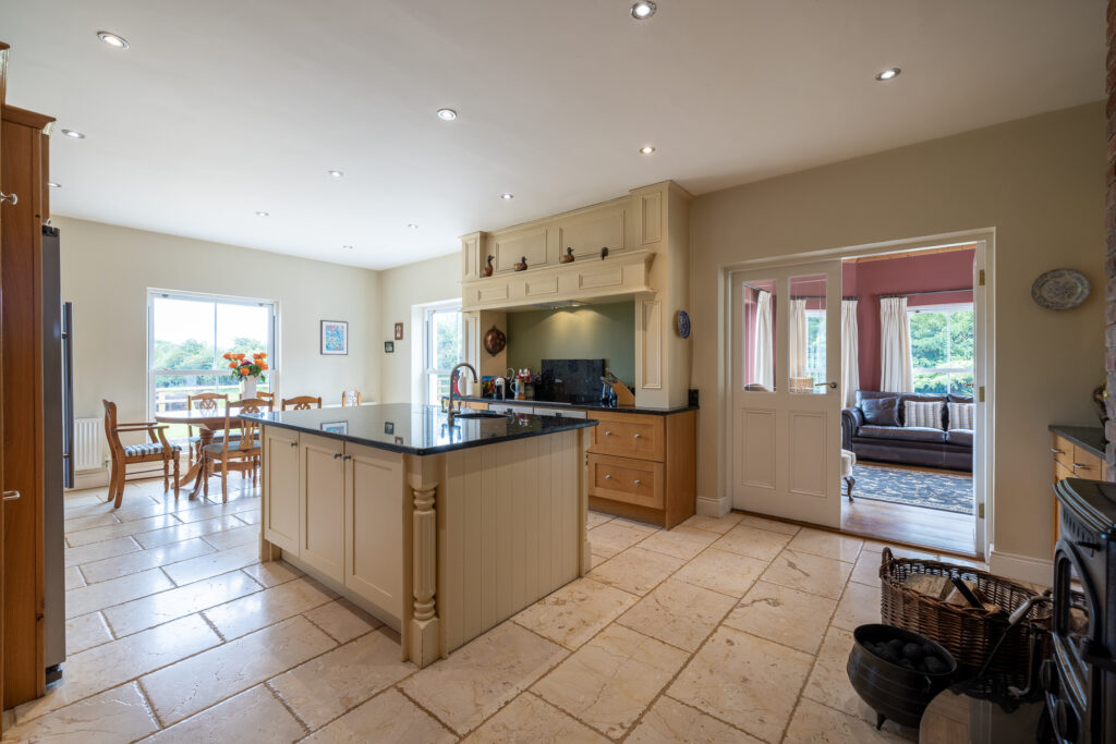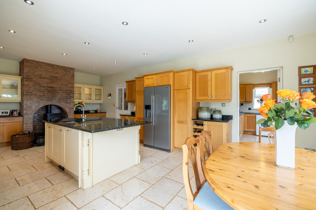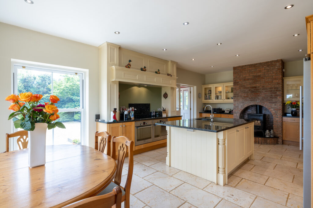 Kitchen/Dining Area 7.65m x 4.42m Tiled flooring throughout, solid fuel stove with redbrick stone surround and chimney breast elevated on a black granite tile. Built in cabinetry right and left of chimney breast and wall mounted cabinets displays. Large central island with breakfast counter and granite worktop and stainless-steel sink insert. Floor and eye level cabinets throughout with five ring induction electric hob with extractor fan and built in surround, double Bosch ovens underneath, ample space with drawers and cabinetry, Samsung fridge freezer with built in cabinetry, floor and eye level and pantry pull out drawers right and left with open wine rack display. Dual aspect dining area with dual aspect overlooking southerly position patio and large window overlooking rear paddocks.