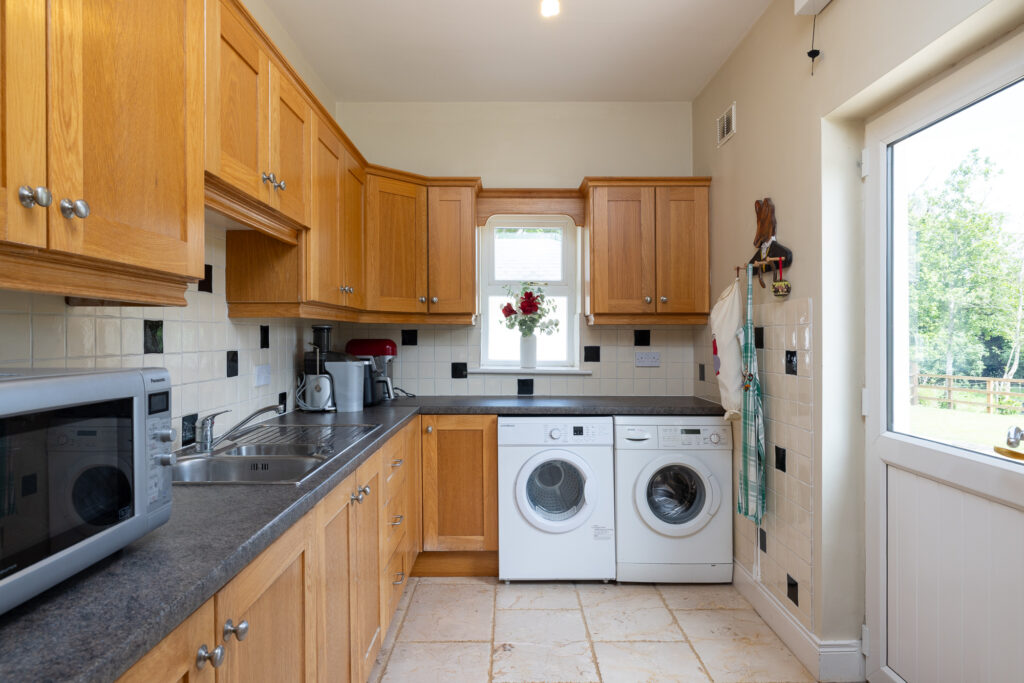 Utility Room/Butlers Pantry 3.34m x 2.20m Tiled flooring throughout floor and eye level cabinets, ample worktop space, double drainer stainless steel sink and tile splashback throughout, Nordmende dryer and Bosch washing machine, window overlooking side garden, door leading out to rear garden.