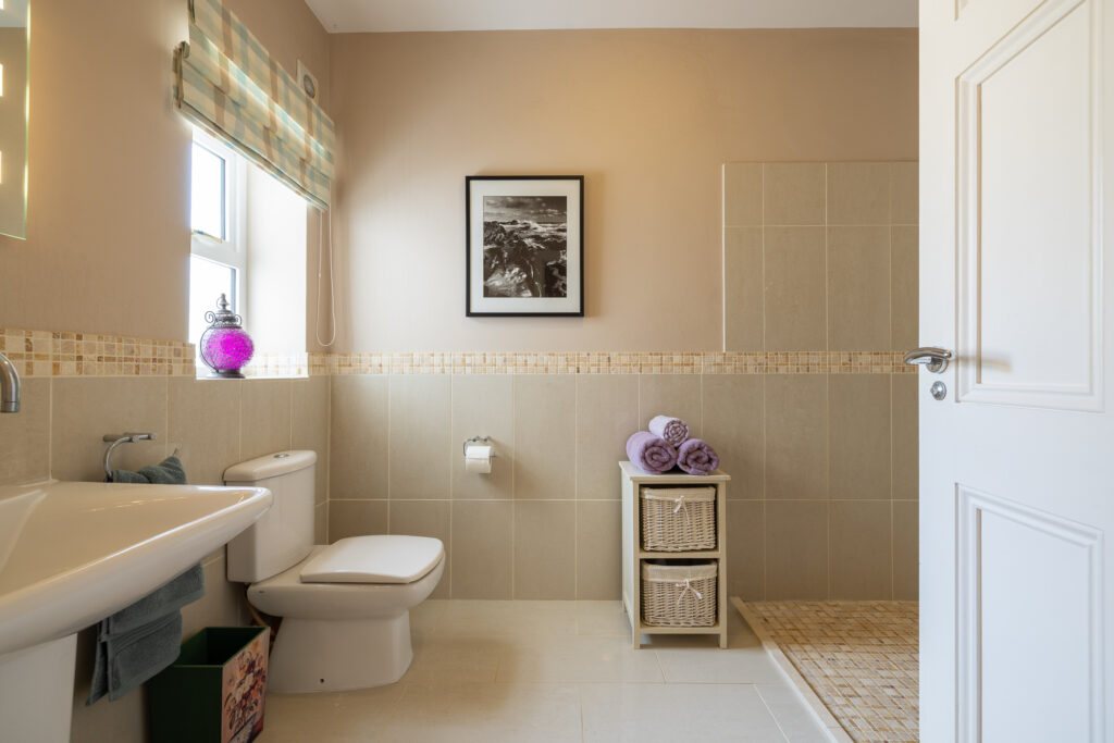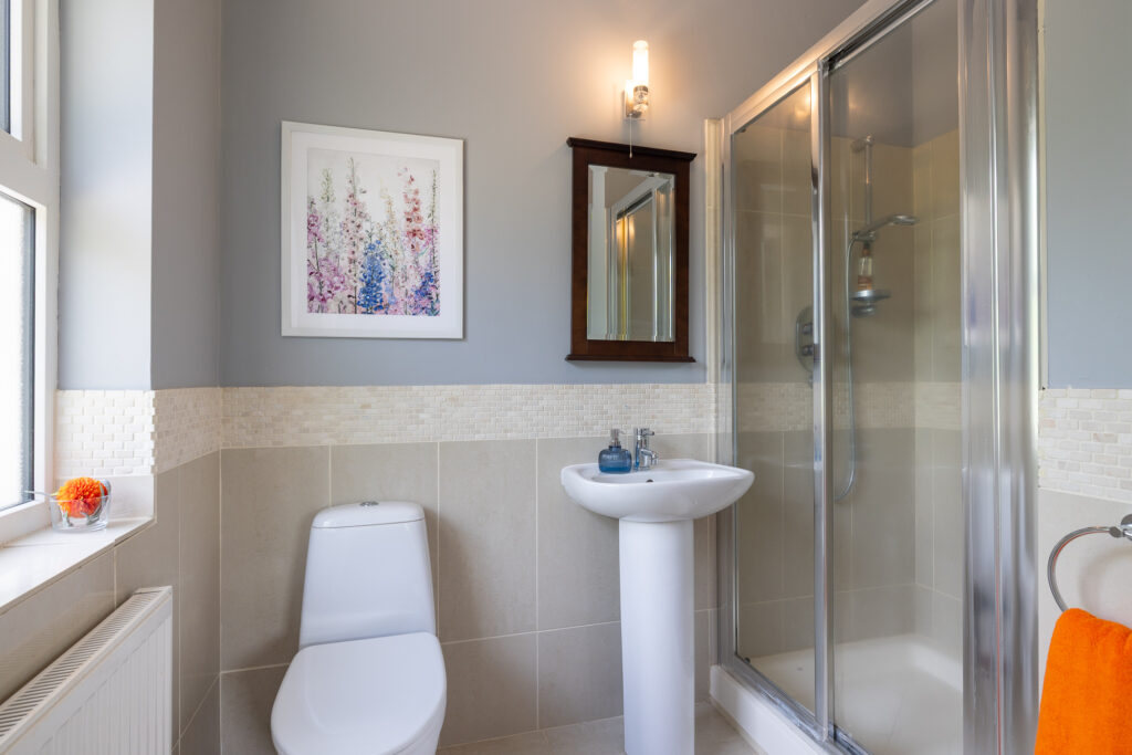 Large En Suite 3.12m x 2.18m Tiled flooring, large open shower with tile surround and pressure pump system, Velux overhead, w.h.b with wall amounted mirror and cabinetry and w.c.