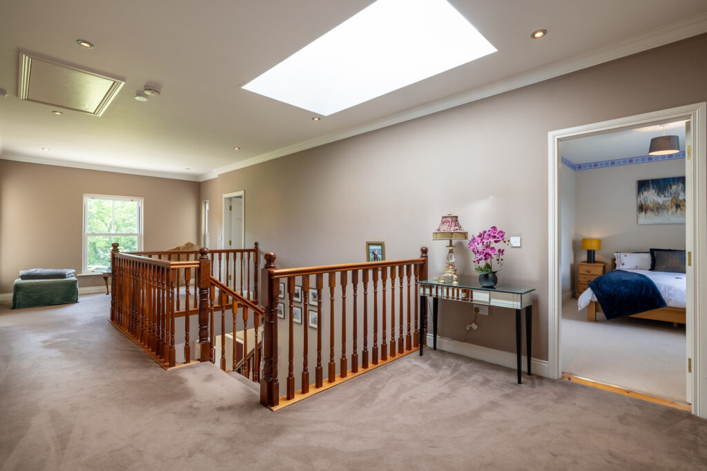 The grandeur continues upstairs with a luxurious landing area, ideal for enjoying a good book while overlooking the beautifully landscaped gardens. The upper level is home to four generously sized bedrooms, soft wool carpeting, with two offering en-suite facilities, alongside a well-appointed family bathroom.