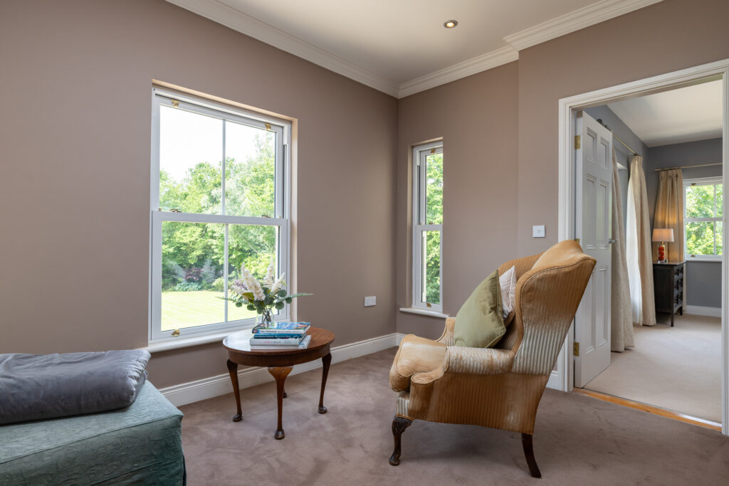 Feature wallpaper dual aspect with sach windows overlooking front garden and side garden.