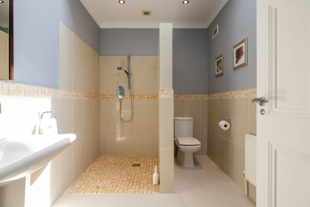 Shower Room 3.37m x 2.13m Tiled flooring throughout, large shower with pressure pump shower valves and tile surround, w.h.b. with w.c.