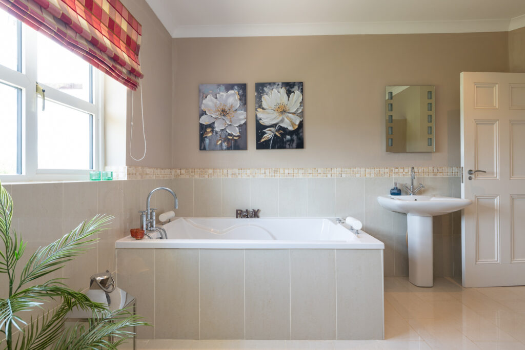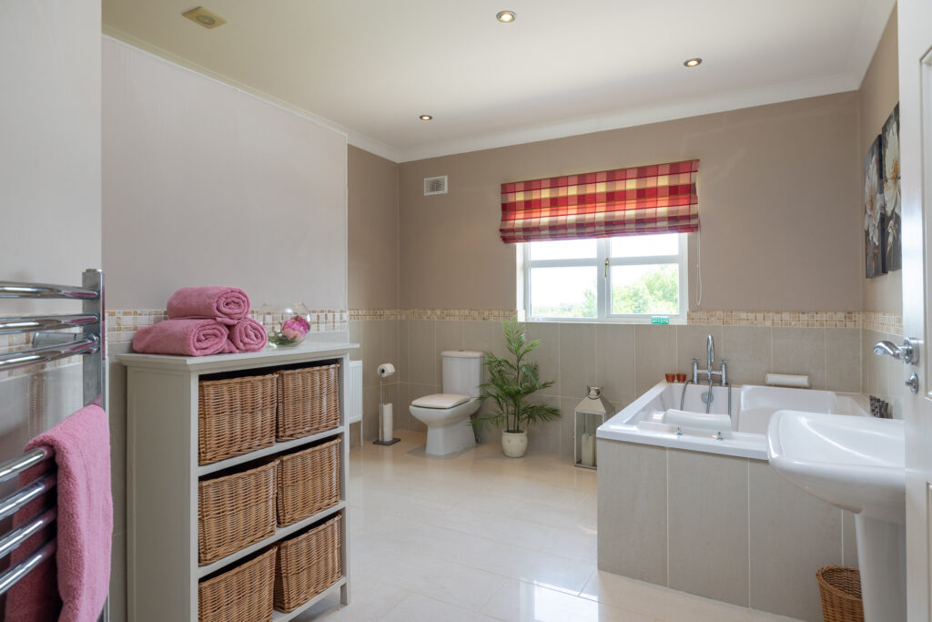 Family Bathroom 4.36m (max) x 3.62m Tiled flooring throughout, large open pressure pump shower, separate jacuzzi bath with chrome faucet and shower head, w.h.b with mirror and lighting over head and w.c., half wall tiled surround, large window overlooking rear garden and paddocks.