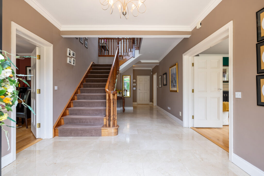 From Central hallway, mahogany staircase with Ulster velvet wood carpet runner leading to: