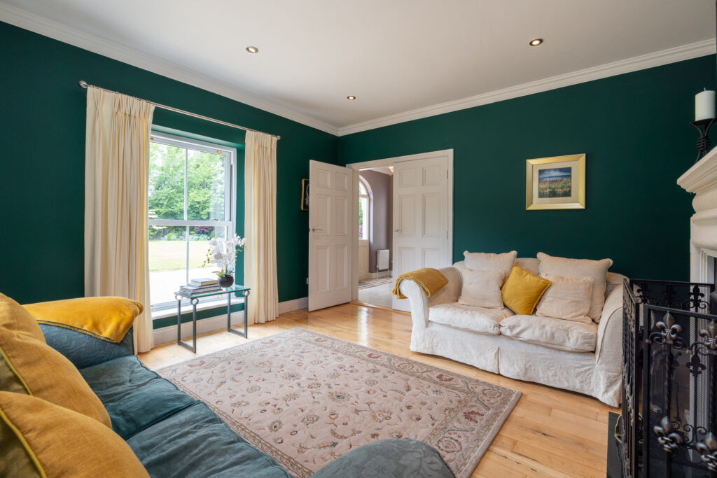 Dining Room (Second Sitting Room) 4.48m x 4.45m Timber flooring throughout, dual aspect with large splayed windows with window reveal displays overlooking front garden and large window overlooking side parking area, tv points and electrical points, feature fireplace with open fire and granite mantelpiece with open fire.