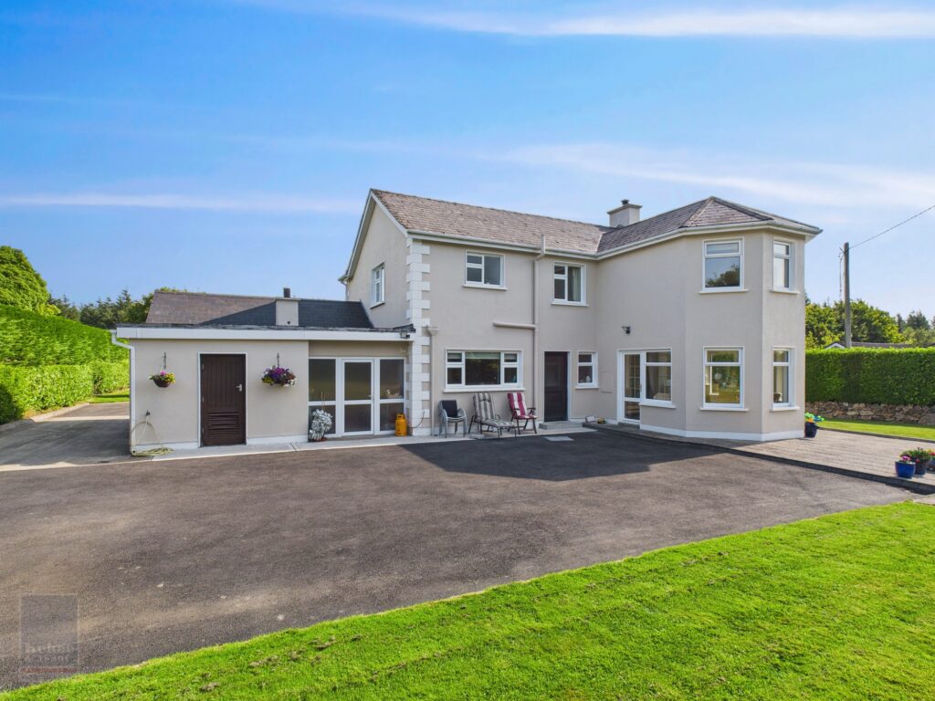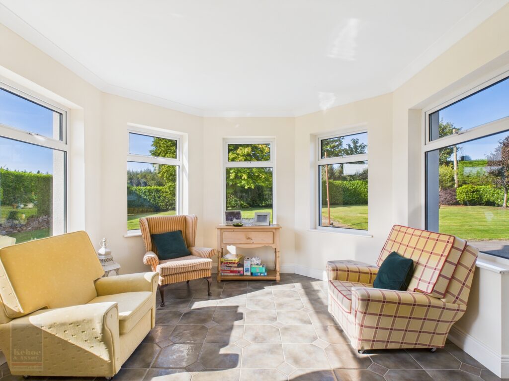The house is further enhanced by a balcony off the landing area, providing an elevated vantage point over the front gardens. Outside, a tarmacadam driveway leads to ample parking, a garage / carport, and a workshop extending to c. 18 sq. m. / 194 sq. ft. with a w.c. Mature boundaries and landscaped lawns ensure a private and peaceful setting, while a large rear patio area takes full advantage of the sunny orientation.