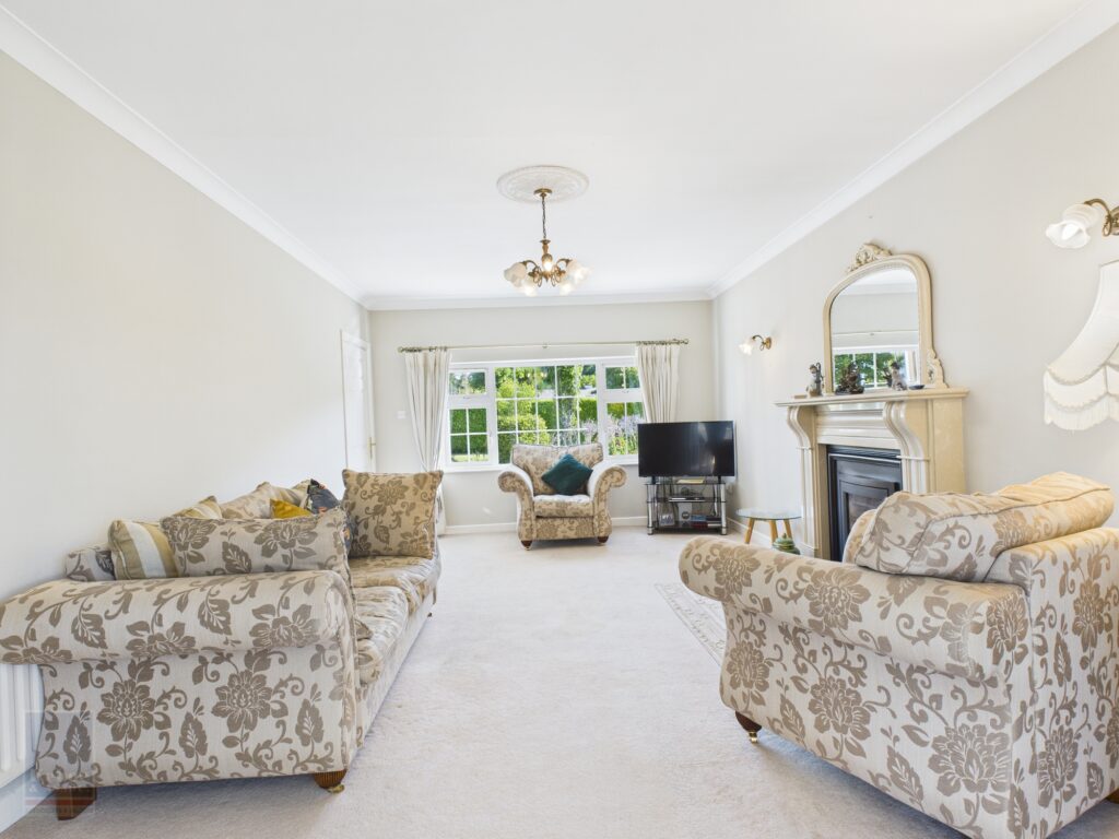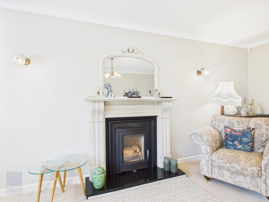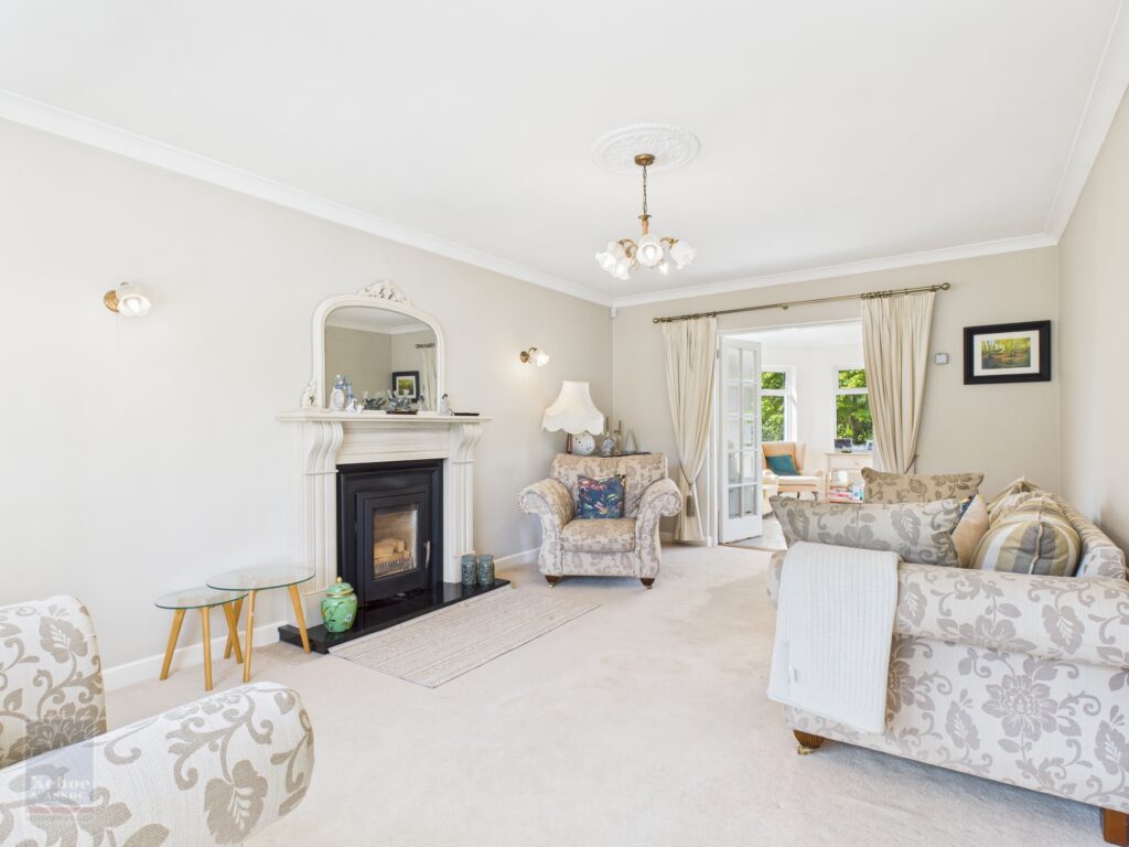 | Sitting Room | 6.13m x 3.77m | Carpeted flooring, ceiling coving, inset solid fuel stove with granite hearth and surround. Double doors into: |