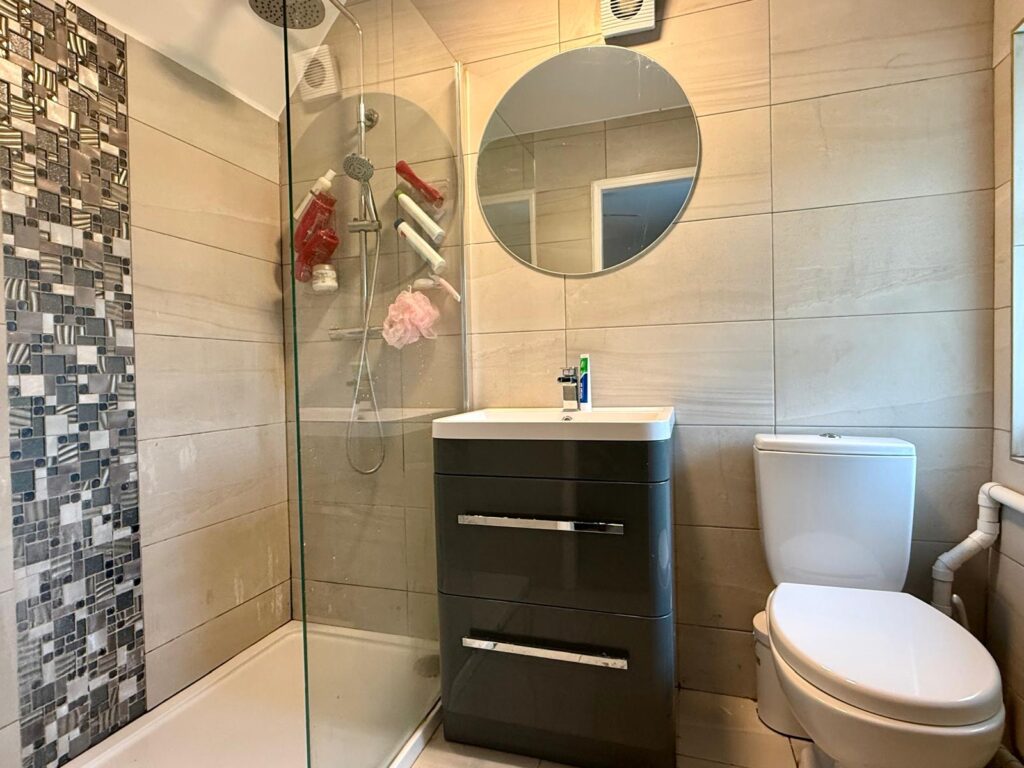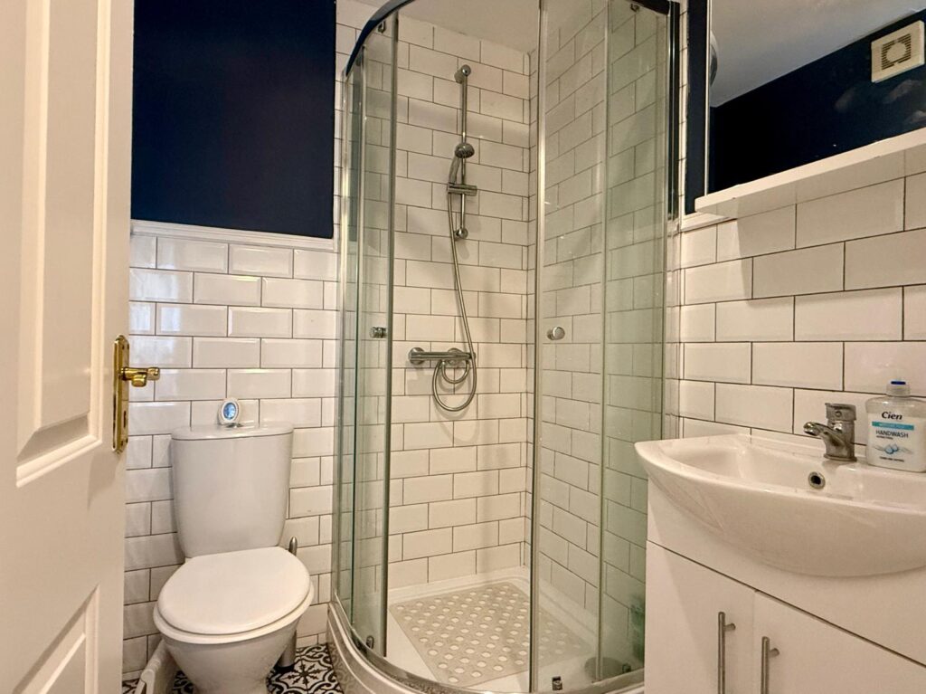 Shower Room 1.66m x 1.41m Completely renovated in 2020, tiled flooring, subway tile surround, enclosed shower with floor to ceiling tile, pressure pump shower set and glass doors, w.h.b with cabinetry underneath, wall mounted mirror and cabinetry within and w.c.