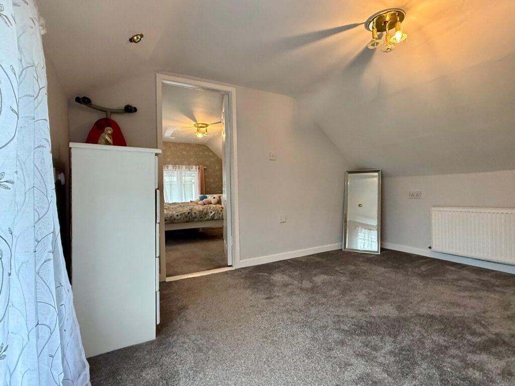 Bedroom 1 2.56m x 2.33m Carpeted flooring, large window overlooking front of house. Storage alcove with hanging rail and electric points.