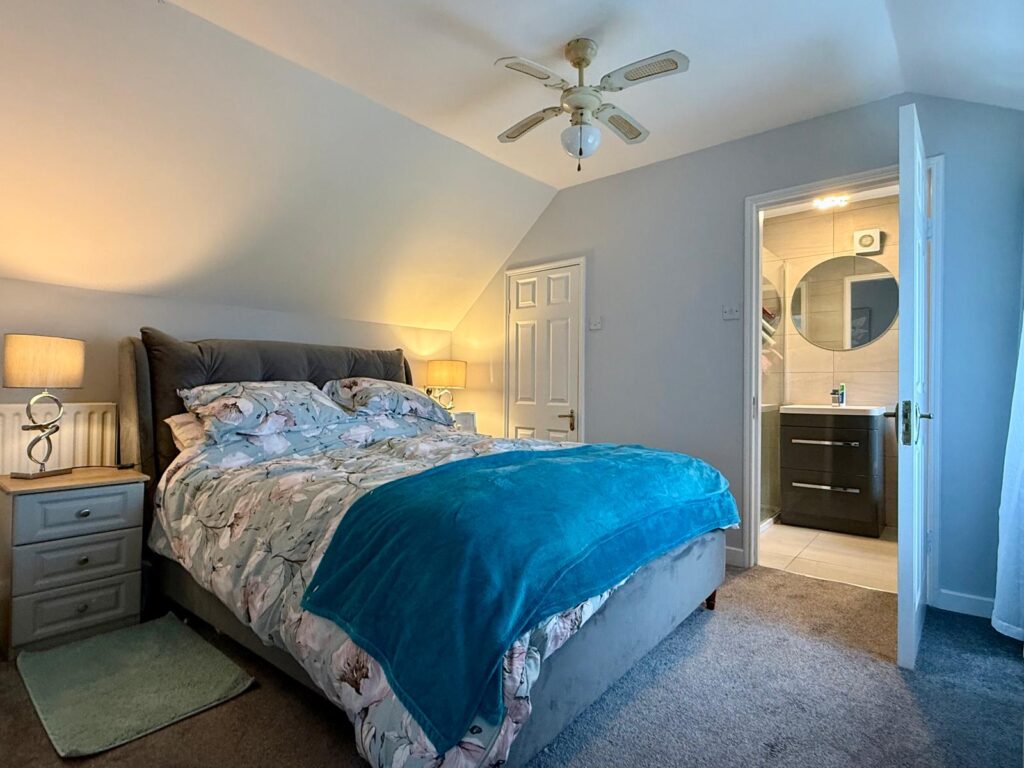 En suite 2.21m x 1.46m Tiled flooring, floor to ceiling tile surround, large pressure pump shower with rainwater shower head, w.h.b. with cabinetry space underneath, mirror overhead and w.c.
