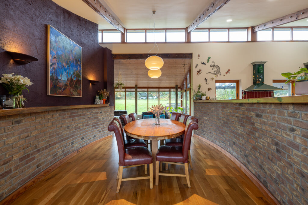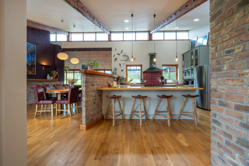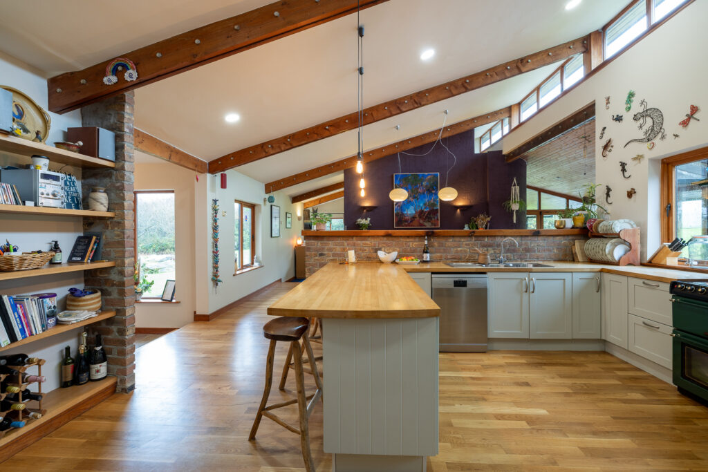 | Kitchen Area | 5.51m x 4.62m | Oak solid timber flooring throughout, fully fitted kitchen with breakfast counter area wrapping around into the working hub of the kitchen which includes Franke double stainless steel sink and drainer with red brick curved wall raised to chest height allowing chef viewing to dining area. Solid timber counter works throughout, integrated drawers and presses with multiple storage systems, appliances include Siemens dishwasher, Belling dual fuel electric and six gas hob with heat plate range cooker under extractor fan and tiled splashback, open timber shelving, storage for pots and display cabinetry with Sharp microwave and free standing Fisher & Paykel fridge freezer, double heighted vaulted ceiling with exposed beams overhead and south facing light shaft extending through the entire living area. |