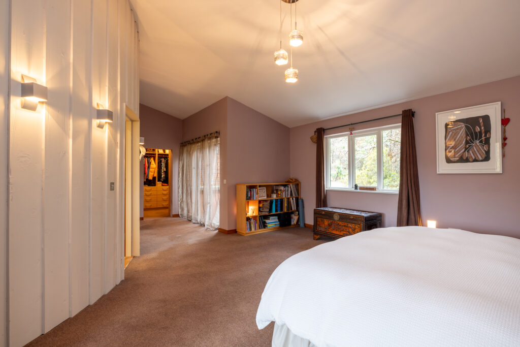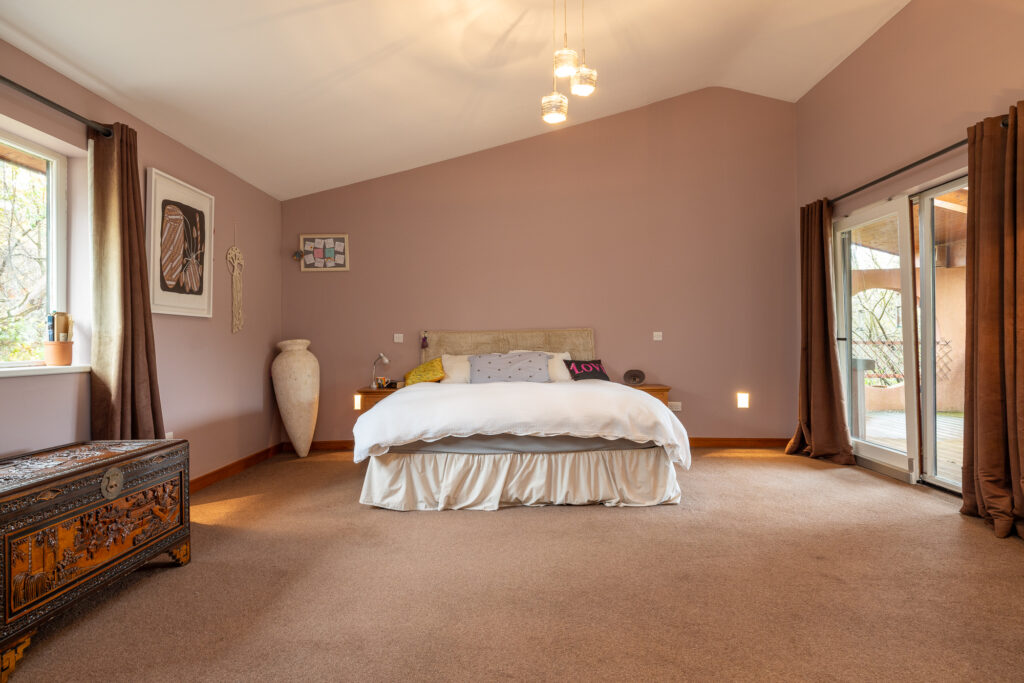 | Master Bedroom Extension | 8.10m x 5.01m | Built in 2008. Carpeted flooring throughout, dual aspect with floor to ceiling windows and sliding doors leading out to raised timber veranda under extending roof leaf with spot lights and light shaft overhead, plug points and hot-tub pipe work facilitation, steps leading down to garden, show casing the perfect window wonderland tranquillity of this home |