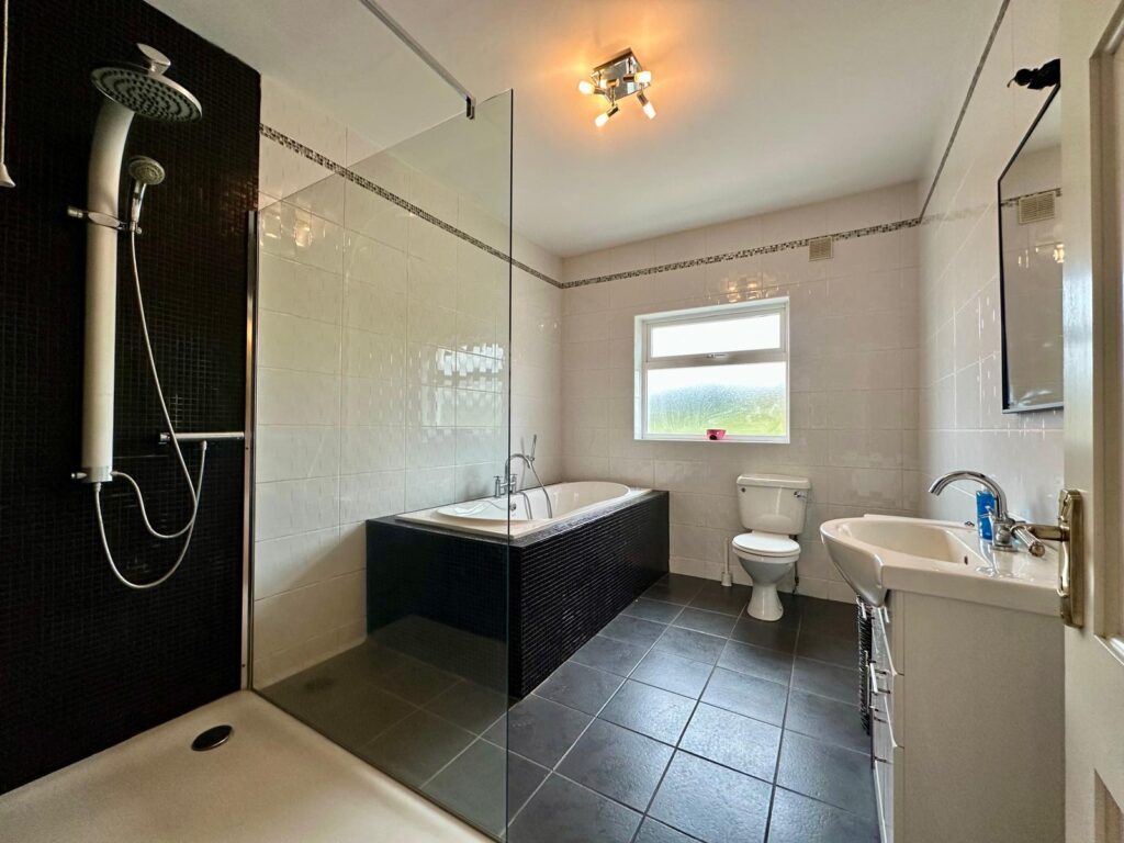 | Family Bathroom | 3.44m x 2.57m | Newly refurbished with tiled flooring, floor to ceiling mosaic tile enclosed in large pressure pump shower with glass wall, jacuzzi bath with mosaic tile surround and floor to ceiling tile surround all walls, w.h.b. with storage cabinetry underneath and w.c. |