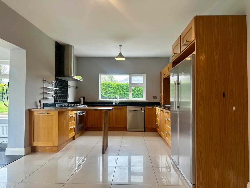 Upon entering the home, you’ll find an elegant entrance hall leading to various functional and inviting spaces. The accommodation includes a spacious sitting room with feature fireplace. The kitchen / dining room extends into a sunroom, offering ample light and a seamless transition between indoor and outdoor enjoyment. The well-appointed and practical utility room with ample built in storage. The bedroom accommodation off the central hallway with hard wood hickory floors offers further built in storage. Leading to a spacious master bedroom with a newly fitted ensuite, alongside three additional bedrooms and newly refurbished family bathroom. This property truly combines the best of idyllic rural charm with modern convenience.
