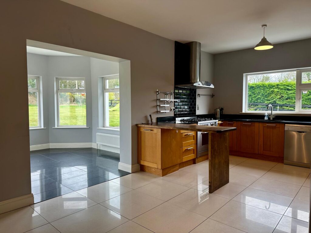 | Kitchen/Dining Room | 6.37m x 3.47m | Tiled flooring throughout, fully fitted kitchen with floor and eye level cabinets, granite worktop with tiled splashback surround and upright granite, double drainer stainless steel sink, Hotpoint dual fuel range oven with 5 gas rings with Fisher & Paykel extractor fan overhead. Breakfast counter space, Bosch dishwasher and free standing Liebherr fridge freezer. |