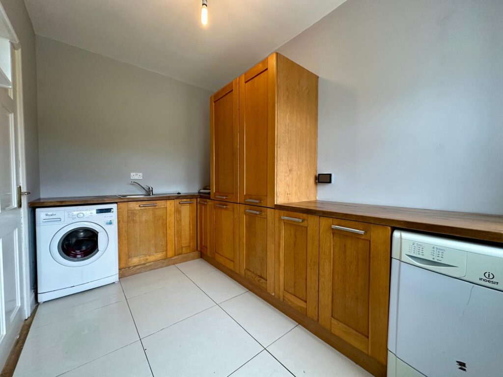 | Utility Room | 3.46m x 2.17m | Tiled flooring, floor and eye level cabinets, Whirlpool washing machine, Indesit dryer and worktop space, ample storage space, stainless steel sink and timber counter. |