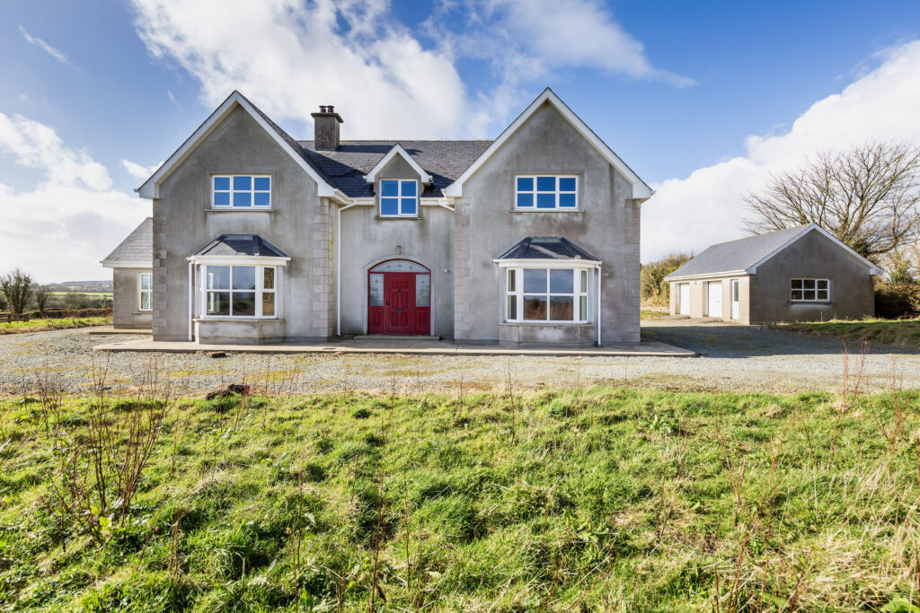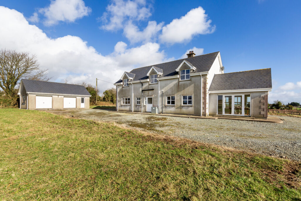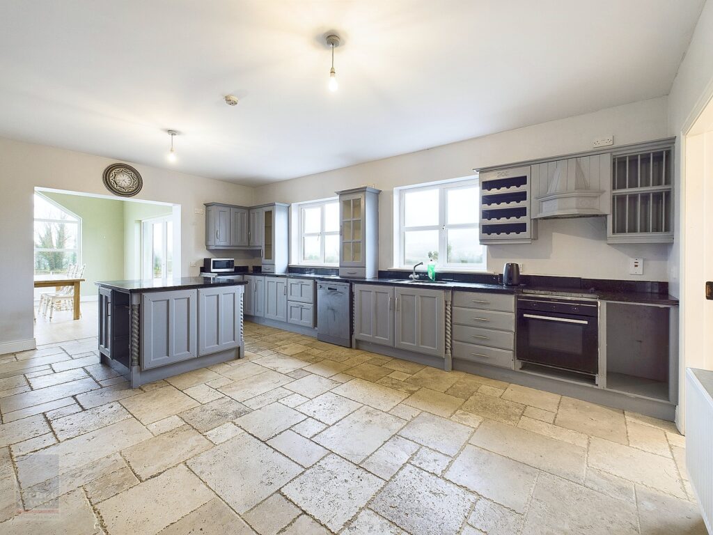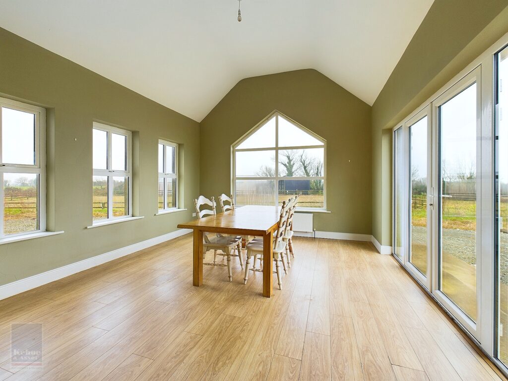 The substantial 5-bedroom residence extends to c. 294 sq.m. / 3,165 sq.ft., offering an abundance of space for family living. Built in 2006, the thoughtfully designed layout includes two ensuite bedrooms, a family bathroom, a Jack and Jill bathroom (between two bedrooms) and a guest W.C., ensuring comfort and privacy for all occupants. The living room with solid fuel stove, provides a cozy yet spacious setting for relaxation. The expansive kitchen, complete with an Stanley range cooker and island unit, flows seamlessly into the dining room. With its vaulted ceiling, triple-aspect windows and south-facing orientation, this space is bathed in natural light and offers a tranquil setting for meals and gatherings with picturesque contryside views. A home office / playroom completes the accommodation ensuring all your family requirements are met.