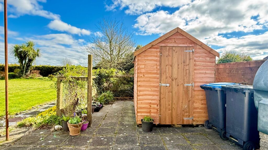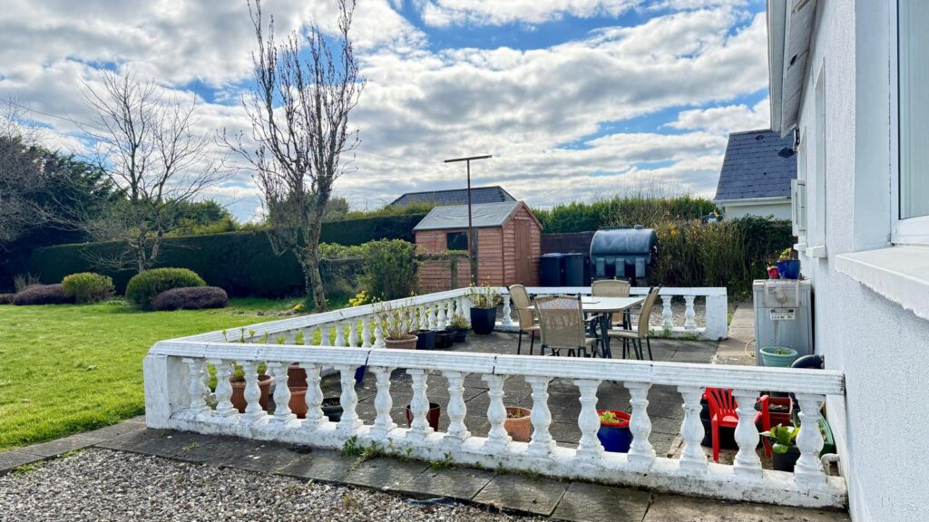 The property is further enhanced by its beautifully maintained gardens, extending to c. 0.59 acres, providing a private and peaceful setting ideal for outdoor living. A south-facing patio and rear garden create the perfect space for relaxation and entertaining, complemented by a newly installed garden potting shed. In addition, there is a substantial detached storage building constructed in 2008, extending to c. 27 sq.m and divided into two rooms with electricity, offering excellent versatility.