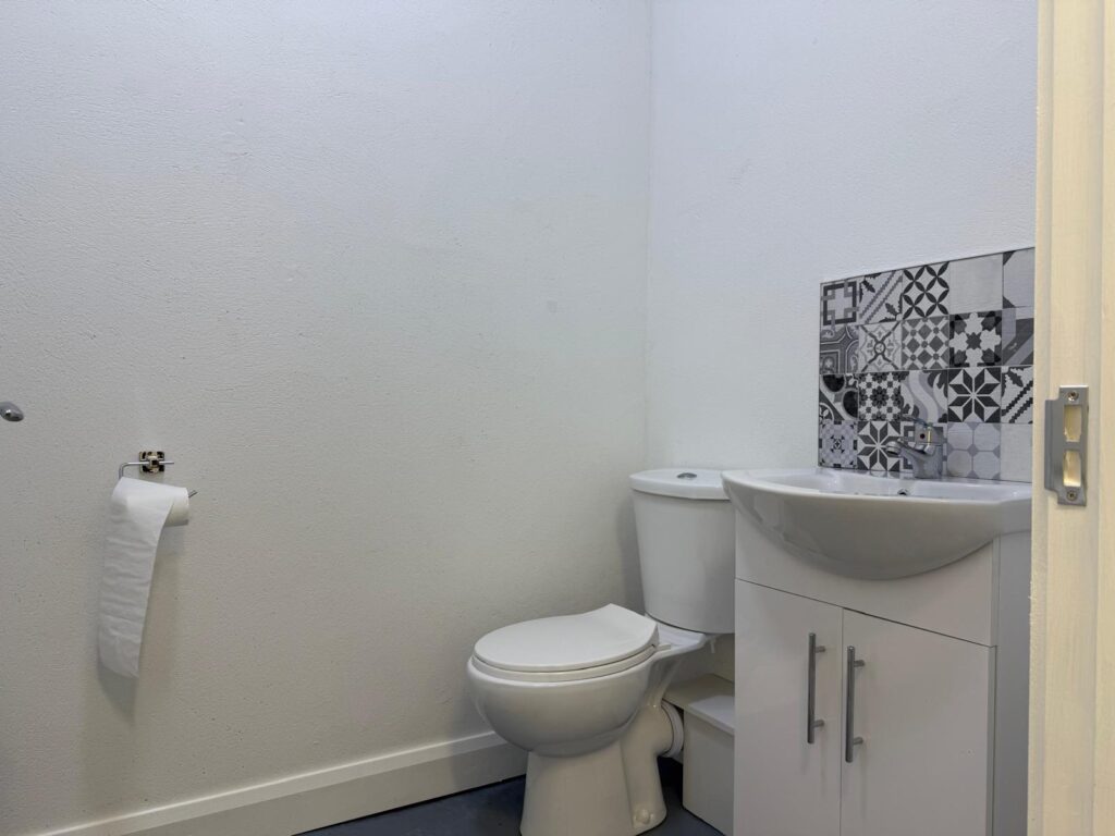 | Toilet | 2.06m x 1.44m | with wash hand basin, tiled splash back and w.c.