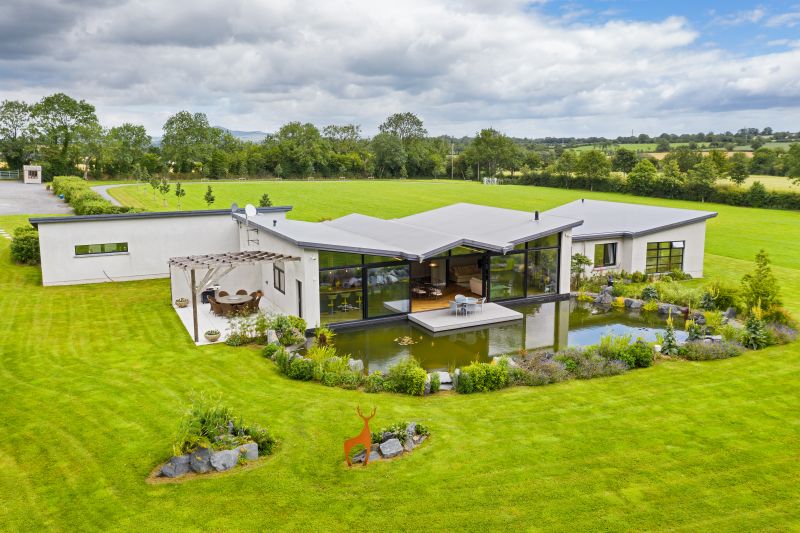 GENERAL DESCRIPTION: Killabeg is a substantial, contemporary, architect designed home extending to c. 3,745 sq.ft. – including car port. It includes extensive gardens of 4.37 acres and a modern general-purpose shed extending to c. 2,279 sq.ft. This wonderful home was constructed in 2015, sitting centrally within the land and nicely set back from an idyllic country road. The property is accessed through a private sweeping lime tree-lined avenue which is flanked by lawns and hedging. All in all, it is a real gem, designed by renowned architect Stephen Carr.