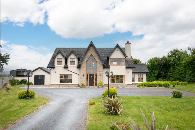 On approach the high walls and tall gates welcome guests to this manor style property approached on a stone filled driveway, kerbs with gardens in lawn on each side. The rear of the property faces onto the rolling countryside views and agricultural fields with mature boundaries to the right and newly planted trees offering privacy and seclusion.